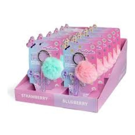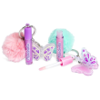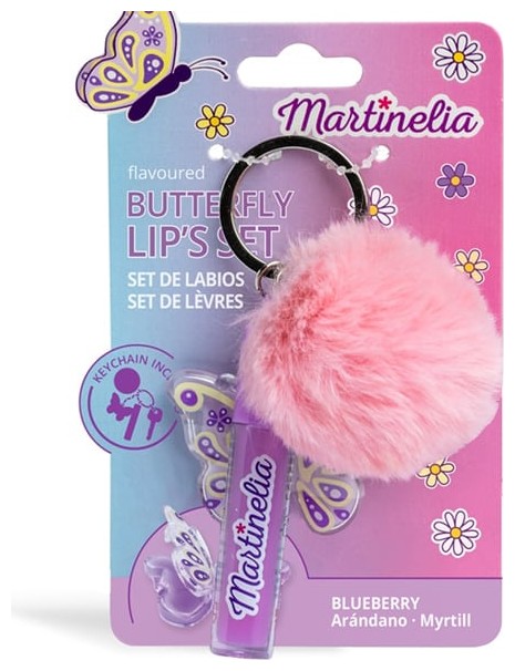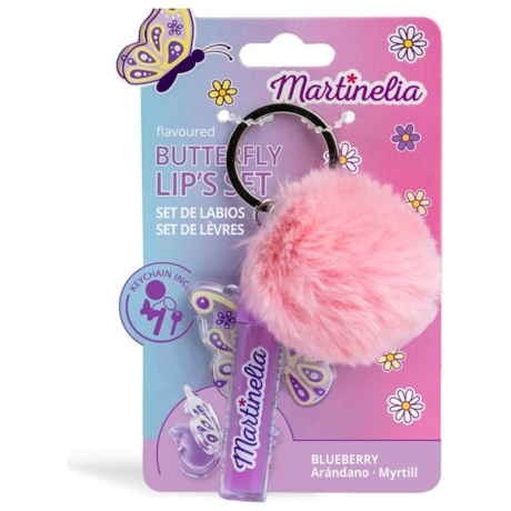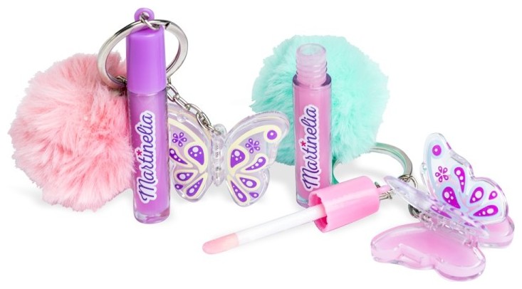 Παιδικό σετ που περιλαμβάνει ένα lip balm σε pot μορφή και σχέδιο πεταλουδίτσα, ένα lip gloss με πινελάκι ενσωματωμένα σε ένα γούνινο μπρελόκ.